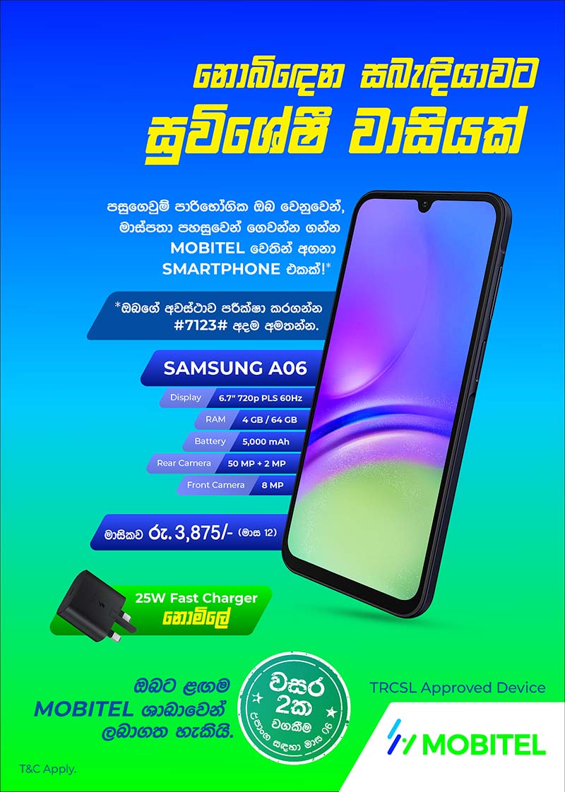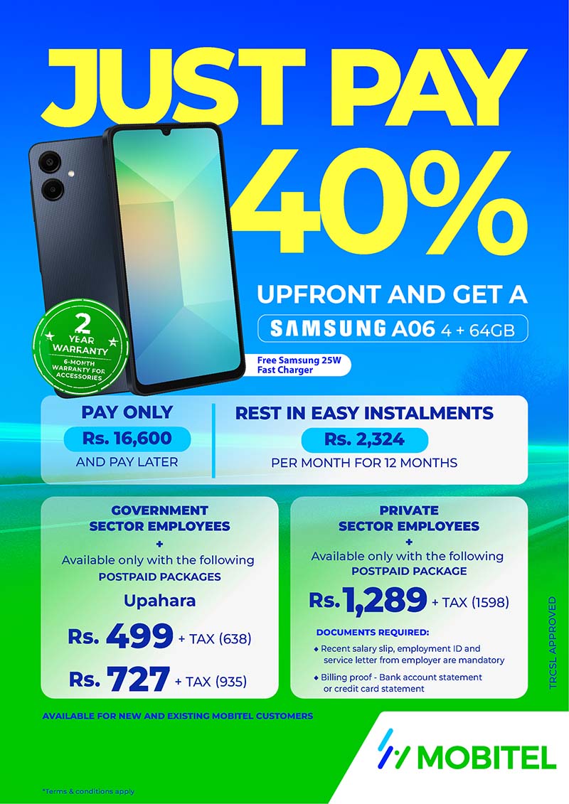 This is a special device installment plan available for Mobitel postpaid customers where you can purchase a Samsung Galaxy A06 (4GB RAM + 64GB Storage) from Mobitel by paying only 40% of the device price upfront (Rs. 16,600) and pay the remaining amount in 12 easy monthly installments of Rs. 2,324 through your Mobitel postpaid bill.