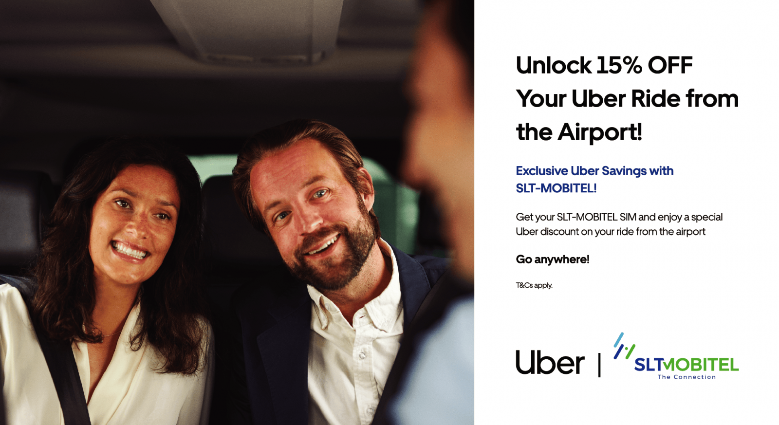 The SLT-MOBITEL Uber Ride Promotion offers customers who purchase an SLT-MOBITEL Tourist SIM or eSIM at the SLT-MOBITEL outlet in the BIA Lobby an exclusive 15% discount, up to LKR 600, on an Uber ride from the airport to their preferred destination.