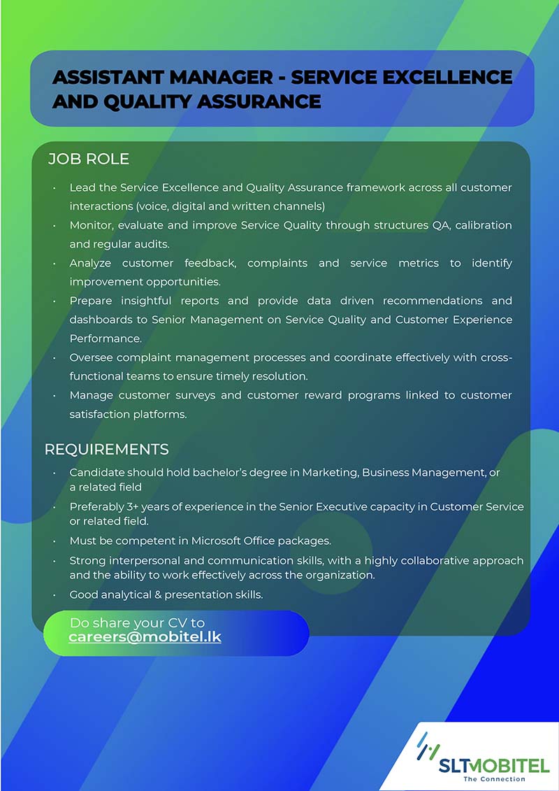 ASSISTANT MANAGER - SERVICE EXCELLENCE AND QUALITY ASSURANCE