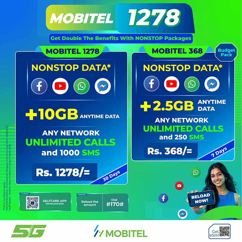 Mobitel Rs. 1,278 and Rs. 368 packages are new Combo packages introduced specifically for Non-stop access to social media applications such as Facebook, YouTube, WhatsApp, and Messenger. They also include additional Anytime Data and Unlimited Voice and SMS benefits. These packages are offered in two versions: a monthly package and a weekly package.